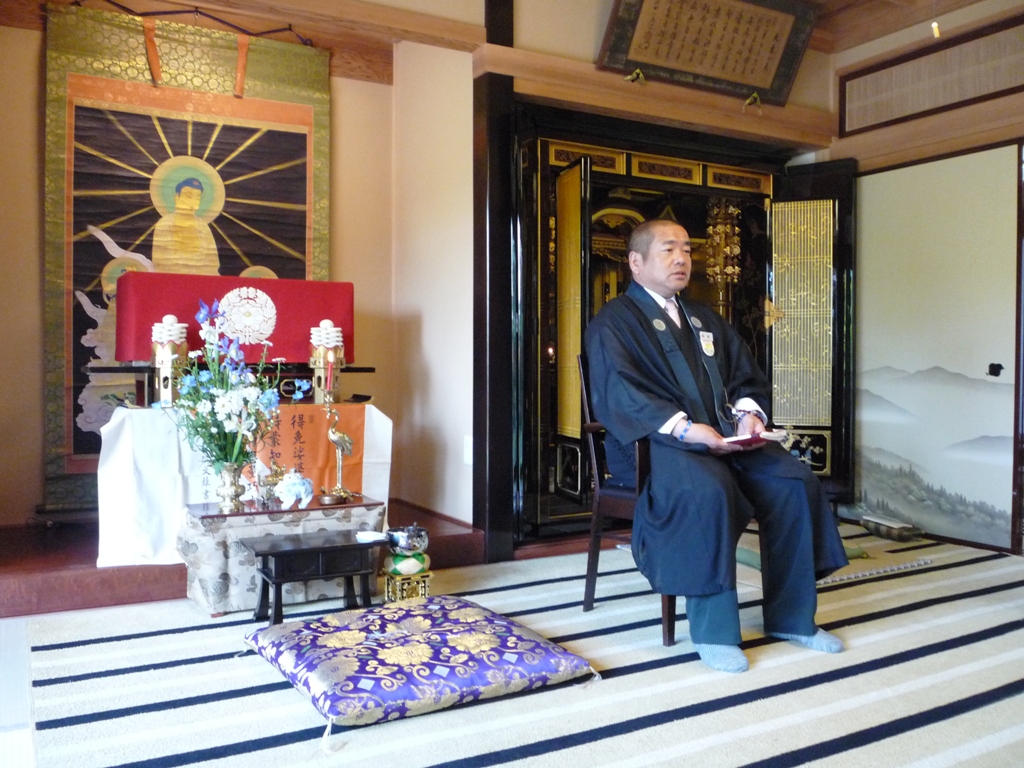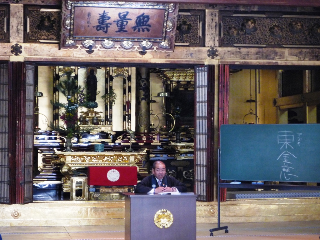 ↑地図17 長浜別院本堂にてお勤めの後、随行教導より法話です。(9:45撮影)