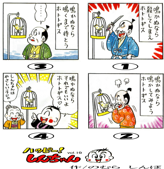 しかし、この四コマ目が「鳴かぬなら、それでもいいよ、ホトトギス」です。