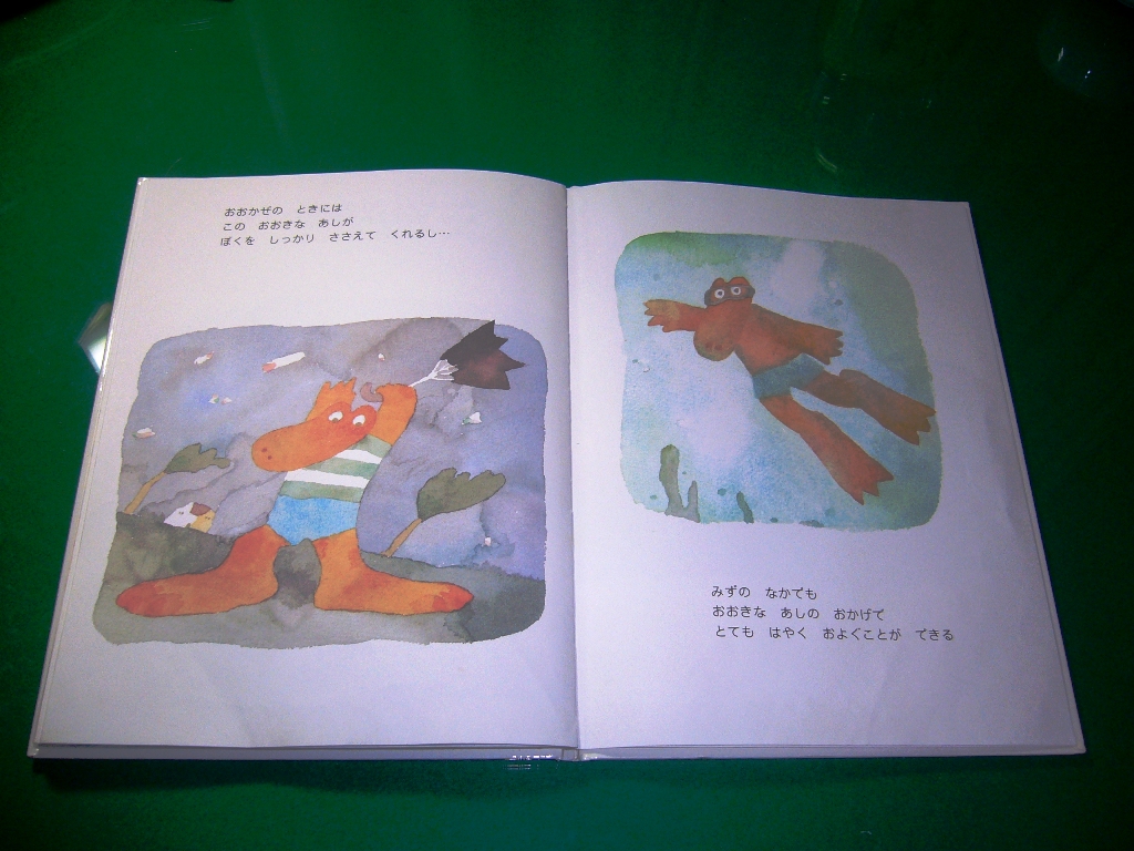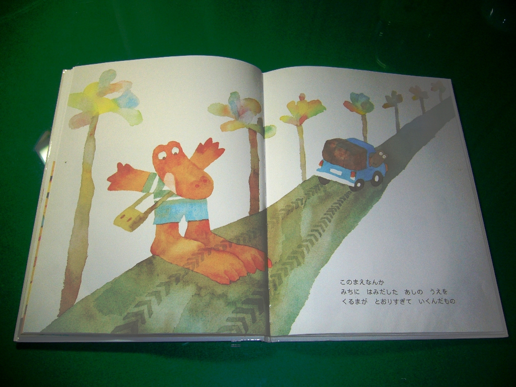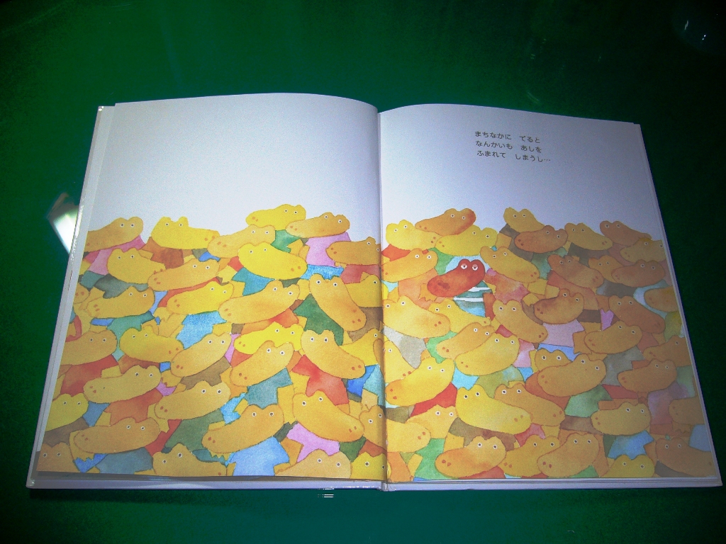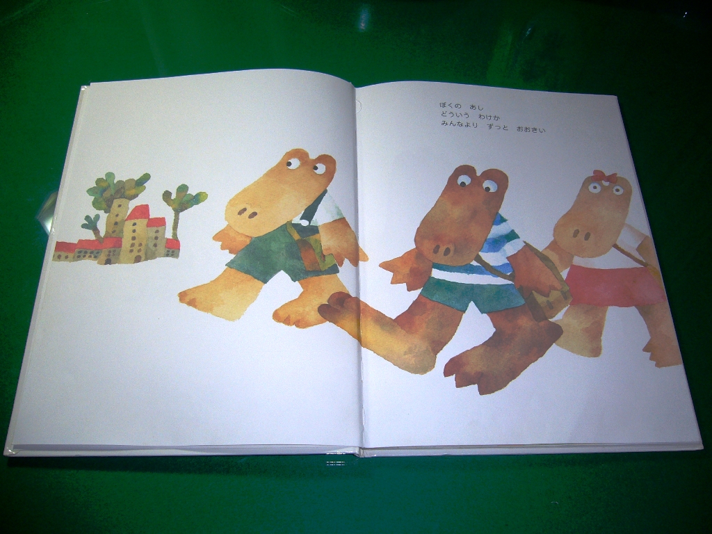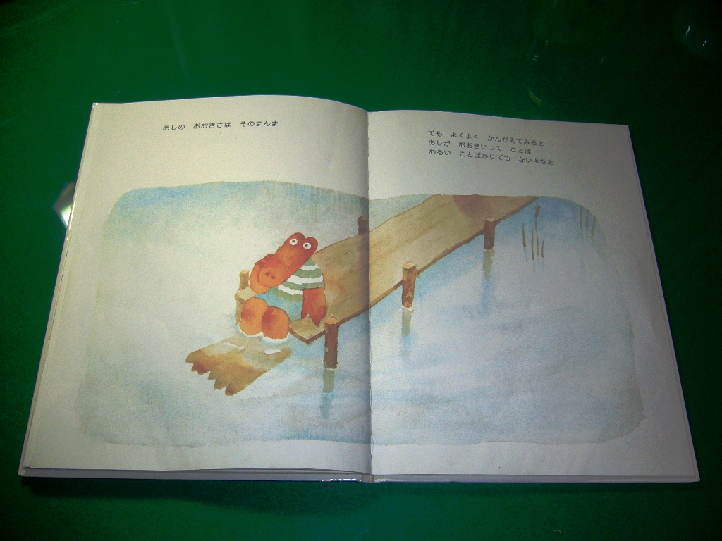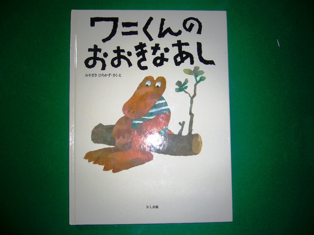 次に「ワニくんのおおきなあし」という絵本を紹介したいと思います。このワニくんは足が大きいというのが悩みなんです。何とか足が小さくなるようにって励んでいるんですが…。読みますね。
