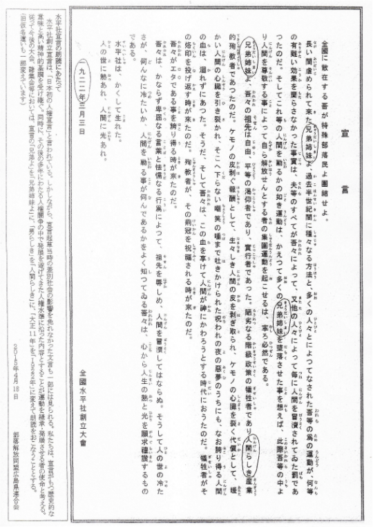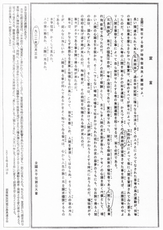 2015年4月18日、部落解放同盟広島県連合会は全国水平社創立宣言の原文から次のように変更して(○印部分)朗読をしています。