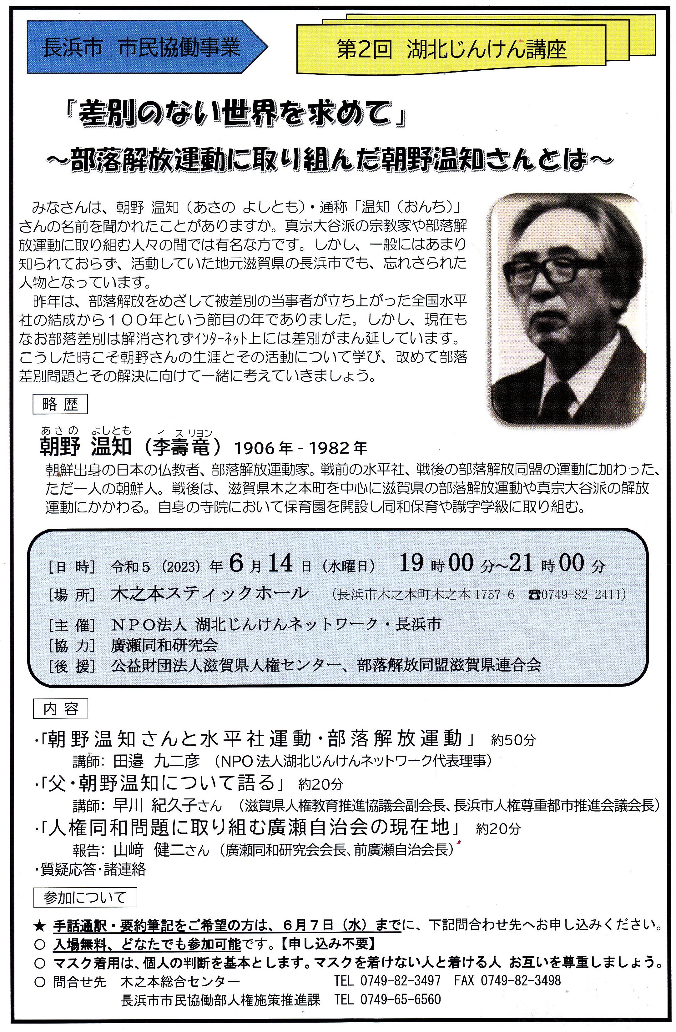 ▼6月14日、長浜市木之本町の木之本スティックホールに於いて、『差別のない世界を求めて』〜部落解放運動に取り組んだ朝野温知さんとは〜に参加しました。