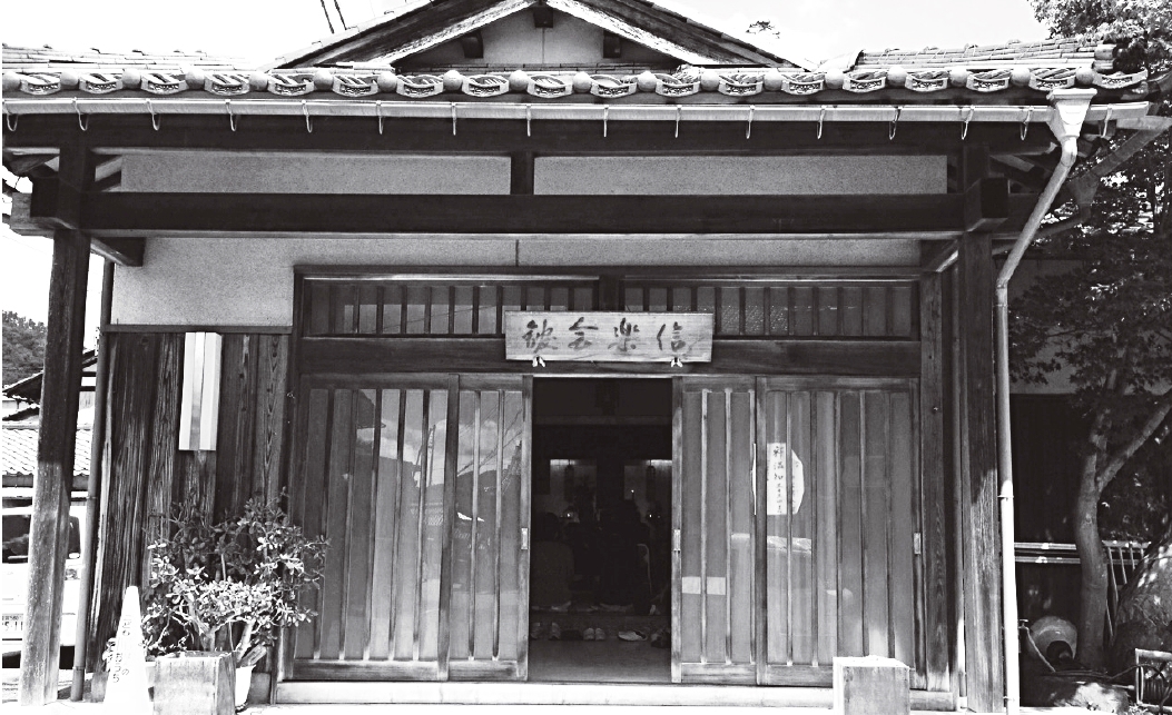 ▼私事ですが、30年前私が浄願寺に入寺した頃、広瀬の寺院「信楽会館(しんぎょうかいかん ※下写真)」の定例法座(毎月朝野温知さんの月命日の2日ではなく、二十二日講からの22日で、正信偈・御文・法話)に何度も行かせて頂きました。朝野温知さんはすでに還浄されていましたが、伴侶のクニさんは私をとても可愛がってくださり、いつもの特性のぜんざいを間に長い時間お話させて頂いたことを思い出します。朝野温知さんの三十三回忌法要の時には、門徒さんや東本願寺の解放運動推進本部、その他有縁の人たちの中、泉惠機先生の命令(笑)により導師(調声)をしたことも良い思い出です。(住職記)