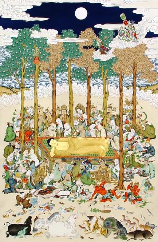 ■お釋迦様は一対四隅の沙羅双樹の下で亡くなられました。そしてその沙羅双樹のうち、片方は枯れ、もう片方はそれに反比例していよいよ活き活きと伸びていくのです。これを「一枯一栄」といい、実は、紙花はこれを形どっているのです。