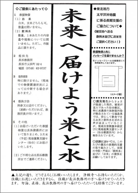 ▼三月十一日、東北地方太平洋沖地震から一年が経ちました。長浜教区では、被災された方々に米と水をお届けしようという取り組みがなされています。(別紙参照 地元の方にはすでに配らせていただきました。)どうぞよろしくお願いします。私も協力させていただきます。 ↓下参照