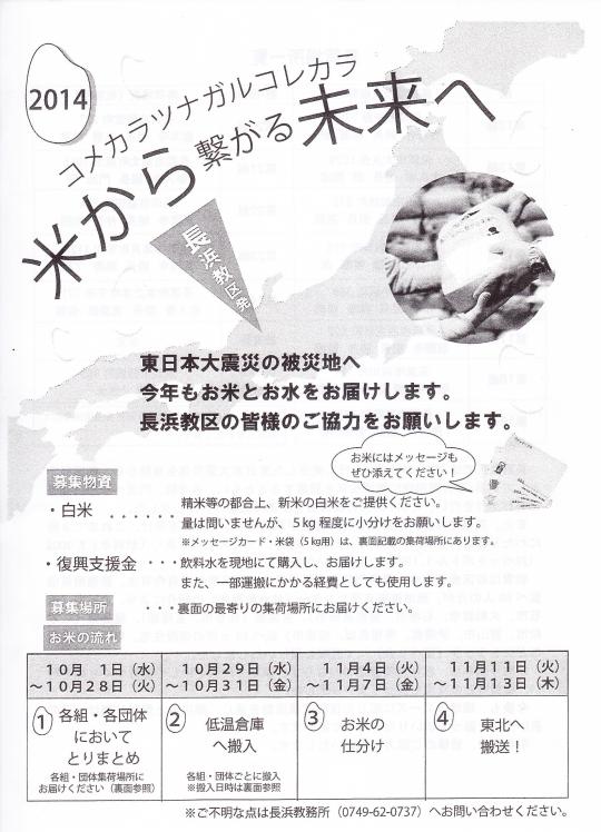 長浜教区では2011年3月11日に発生した東日本大震災発生直後から、教区対応として長浜・五村両別院に救援金箱を設置するとともに、各寺院、門徒へ救援金勧募の呼びかけを行い、1,311万円の救援金を宗派にお届けいたしました。また、現地では飲料水及び食品の需要が高まっていることを受け、これまで3回にわたり教区内寺院、門徒から「お米」約17トン(5キロ入3,400袋)、「飲料水」2,300リットル(2リットルペットボトル1,150本)を提供いただきました。物資は教区会参事会、教区門徒会常任委員会、教区教化委員会有志、教務所員他延べ50人の方が、現地復興支援センター(仙台教務所)の紹介により、岩手県(釜石市、大船渡市、石巻市、陸前高田市)、宮城県(仙台市、亘理郡)、福島県(二本松市、郡山市、伊達郡、南相馬郡、相馬市)延べ29ヵ所の仮設住宅、寺院、幼稚園などにトラック(延べ6台)にて直接お届けいたしました。 本取り組みは、救援物資搬送のみならず、現地では炊き出しや念珠づくり等を行い、被災者との交流も図ってまいりました。 今後も、現地のニーズに応じた復興支援活動を通じ、被災者と繋がり続け、息の長い支援を図ってまいりたいことであります。引き続き、皆様のご協力お願いいたします。