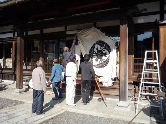 ↑11月14日(金)朝 山門 提灯設置 幕張り