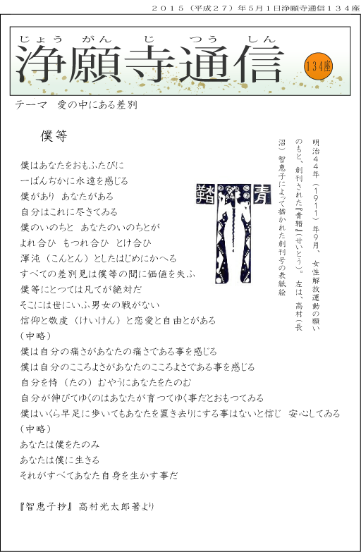 ■悲しいかな、人間には愛の中においてさえ、相手を抑圧し、差別していくことがあります…。世間の習俗に埋没し、それどころかそのことをよしとし、一向に問うことのない者たちが実は、男女差別をはじめあらゆる差別を生み出す張本人なのだと思います。