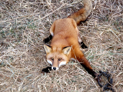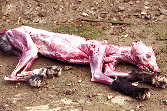 写真は、JAVA(NPO法人動物実験の廃止を求める会)のホームページに掲載されていたもので、人間の着る毛皮のコートのために皮を剥がされたキツネの死体です。同じページに次のように書かれてあります。