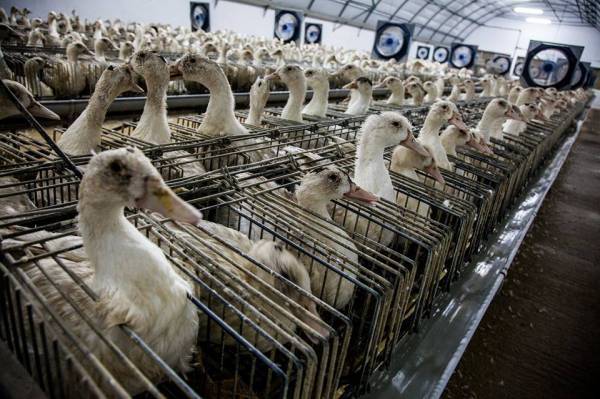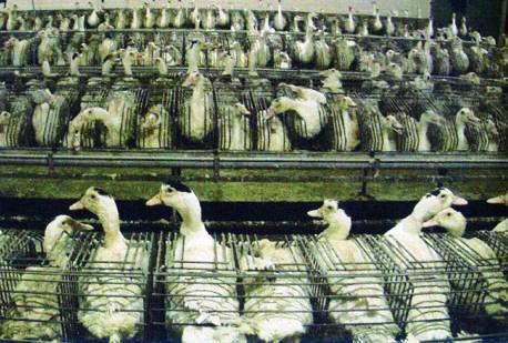 金属パイプをガチョウの口に差し込み、食道に強制的に餌を流し込み、約一ヶ月でガチョウの正常な肝臓を通常の10倍ほどにまで肥大させる。つまり、ガチョウを人工的に脂肪肝にさせるのだ。ガチョウは殺され、取り出された病的な肝臓は「世界三大珍味」のひとつ、フォアグラとなって、グルメと呼ばれる人間の口に運ばれていく。