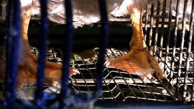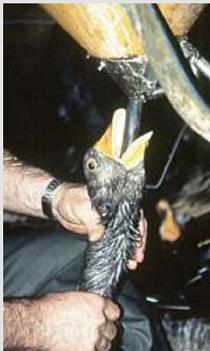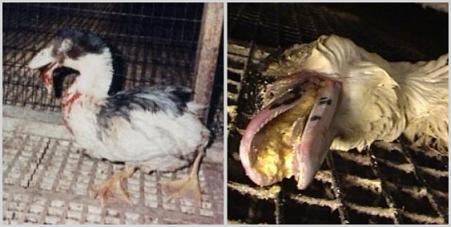 中には、パイプを乱暴に押し込まれたためにくちばしが折れてしまったり(右左写真)、喉と食道に残留したコーンが腐敗して、口から体の内部にまでバクテリアと菌が増殖し、ひどい苦しみと様々な病気を引き起こすのです(左上写真)。そしてこの時点で殺処分されます。