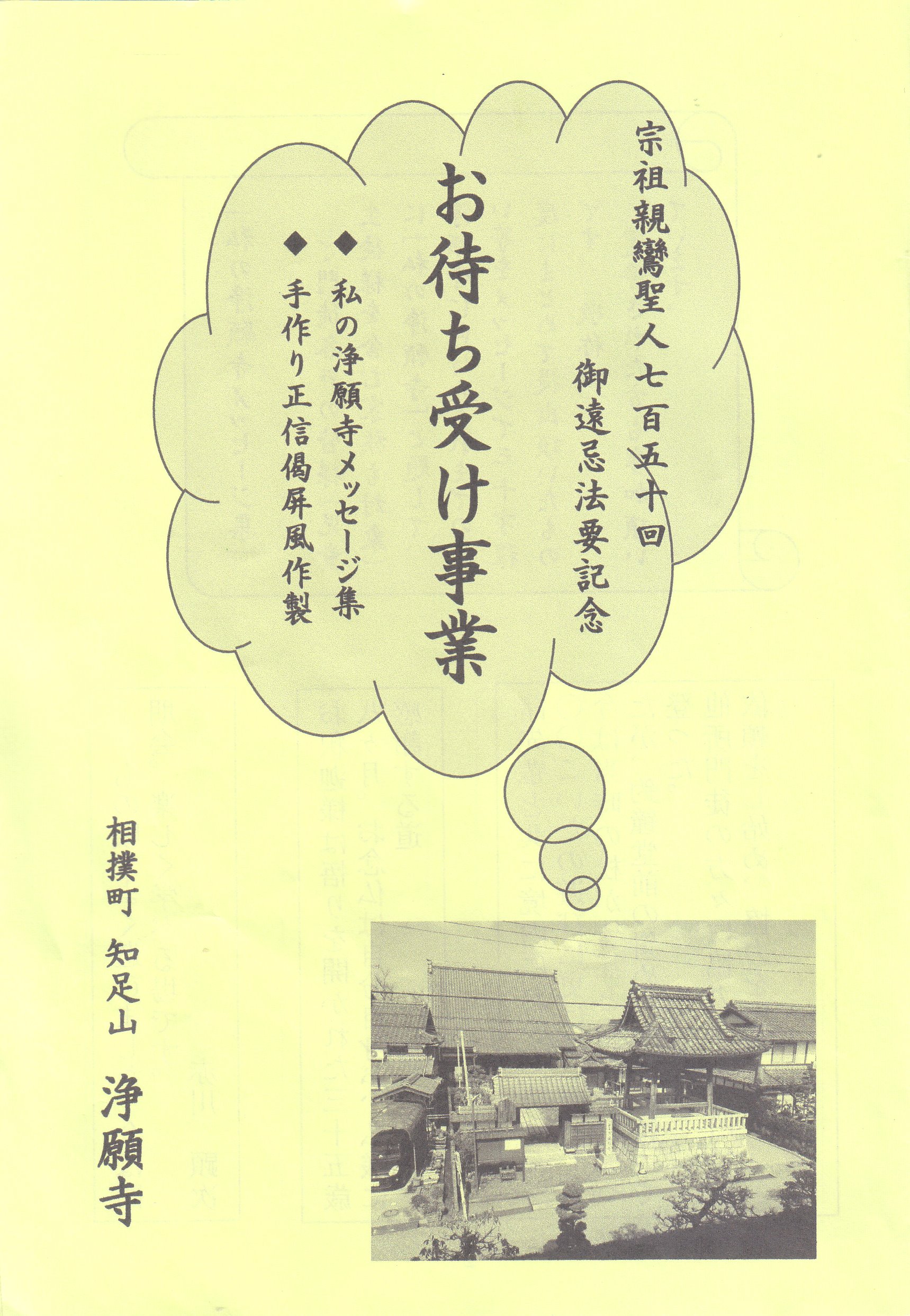 今から七十数年前の事になります。まだ小学校に入学する迄の事ですが私は良く祖母に連れられお寺さん(浄願寺)へお参りさせて戴いた記憶があります。当時、浄願寺報恩講は十二月二十三日〜二十五日にお勤めなされておりました。報恩講には大きなお釜で煮たお講汁を戴く事になっていた様で祖母が戴く「お椀収箱」を持たされ、腰の曲がった祖母とお参りしお勤めを聴聞させて戴いた事が思い出されます。月日の経つのは早いもので八十才も半ばになった今日、知足山浄願寺の御遠忌をお迎え出来ます事はこの上ない慶びであり幸せ者と深く感謝しております。御住職様始めお世話して戴いた役員の皆様方に厚く御禮申し上げます。