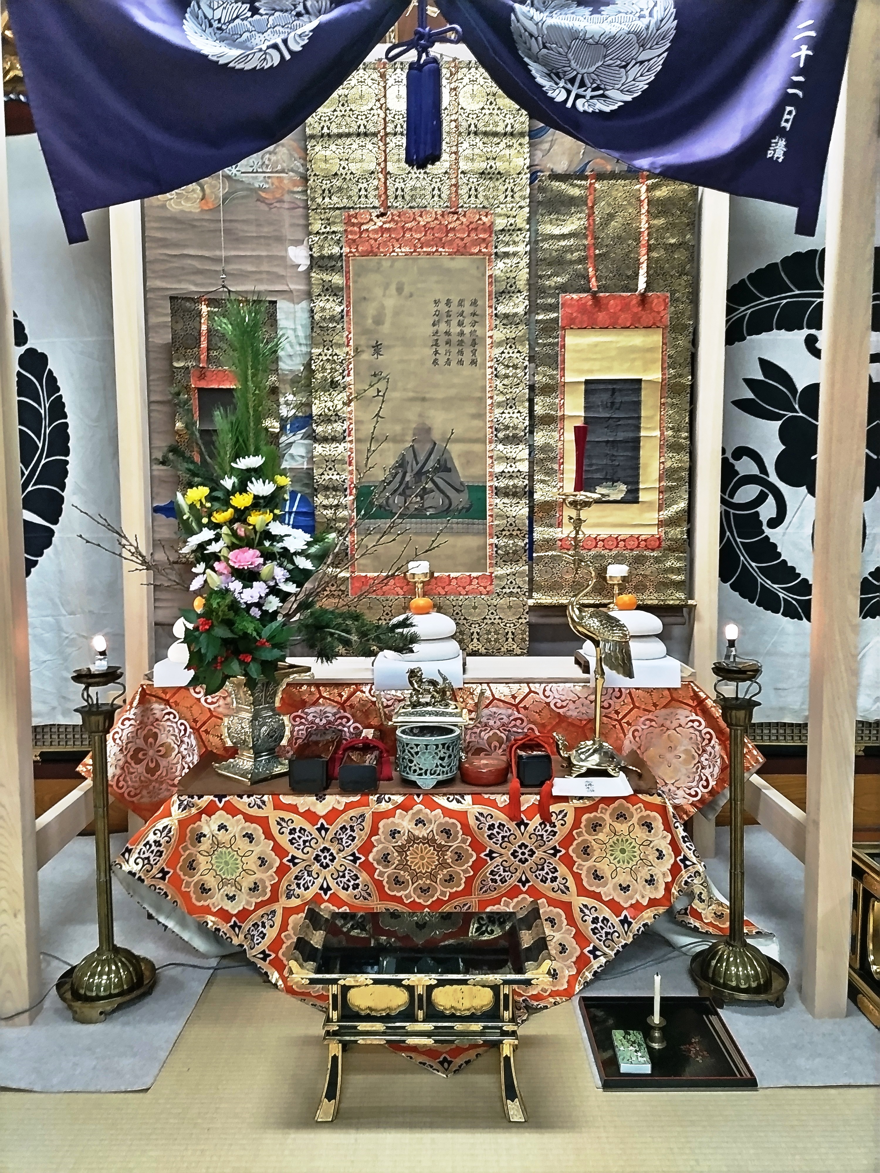 毎年十二月二十六日から翌一月八日まで、二幅の御影を双懸(そうけん)して「御越年(ごおつねん)法要」が営まれ、参詣された各組の代表者がここで供えられたお鏡(二十四枚)を分けて頂いて帰り、これに餅米をつき混ぜ「鏡割り法要」を厳修し、この御座にお参りした各集落の世話方は、頂いたお鏡に更に餅米をつき混ぜて必要な量のお鏡やお華来を作り、集落毎の「御巡化(ごじゅんけ)法要」をお勤めしてお供えを各戸に配られる仕組みになっています。