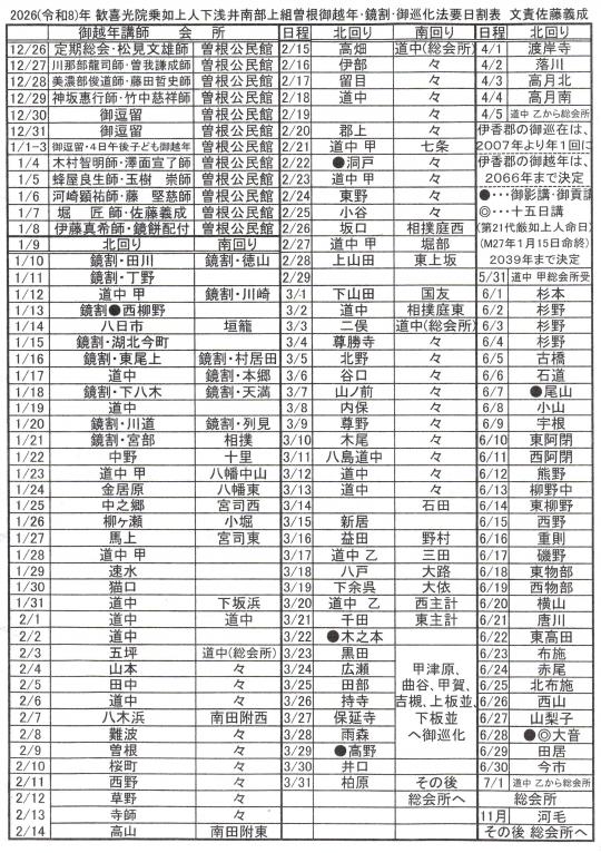 「御越年法要」はこの組織の一から六の順序でお勤まりになり、その後、一から三の組織で一幅の御影が、四から六の組織であと一幅の御影が御巡在になりますが、「鏡割りお講」は各組織のそれぞれ数カ所(概ね旧村落)で、営まれ、そのあと各集落への御巡在となる訳であります。