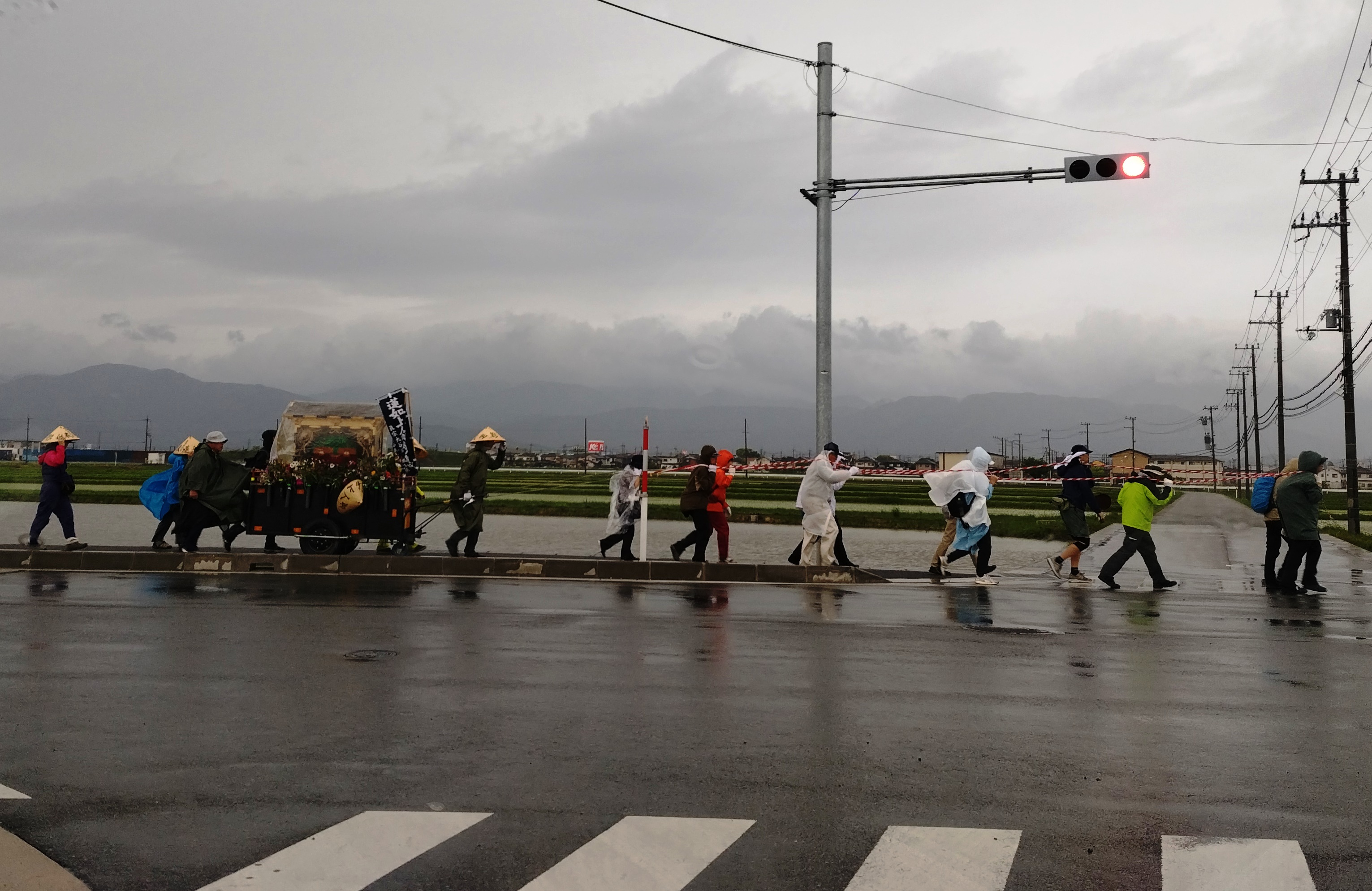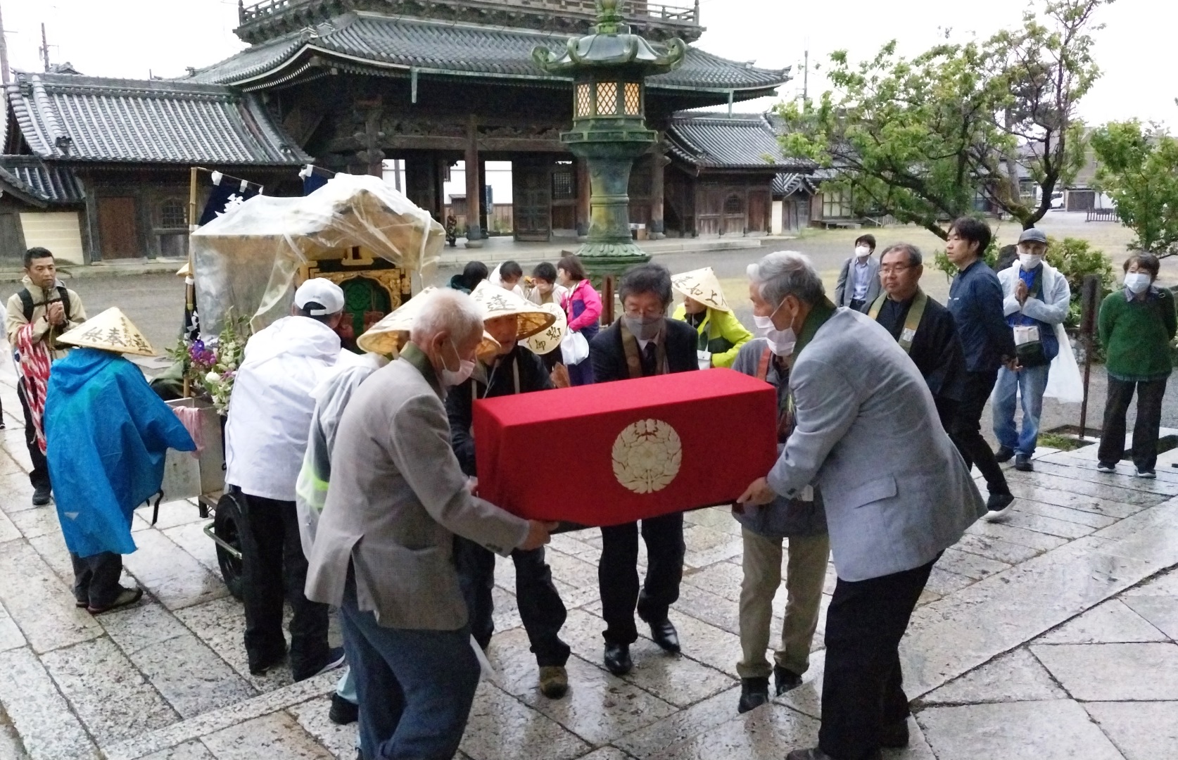 ▲蓮如上人(一四一五〜一四九九)が亡くなられた後、北陸、吉崎での教化の御苦労とそのお徳を偲ぶ法要のご縁が生まれ、蓮如上人の御影を本願寺よりお迎えして勤められたのが蓮如上人御影道中の始まりです。それ以来、毎年、吉崎別院で蓮如上人御忌(ぎょき)法要が厳修される時期に、蓮如上人が歩いたといわれる吉崎別院までの約二四〇キロの道程を、随行教導(ずいこうきょうどう)や、宰領(さいりょう)をはじめとする供奉人(ぐぶにん)方が中心となり、自主参加(一般参加)の方々とともに、六十七の会所に立ち寄りながら一週間かけて歩き(御下向(ごげこう))蓮如上人の御影を門信徒の待ち受ける吉崎の地へ運ぶ旅が連綿として続けられています。今年は351回を迎えました。