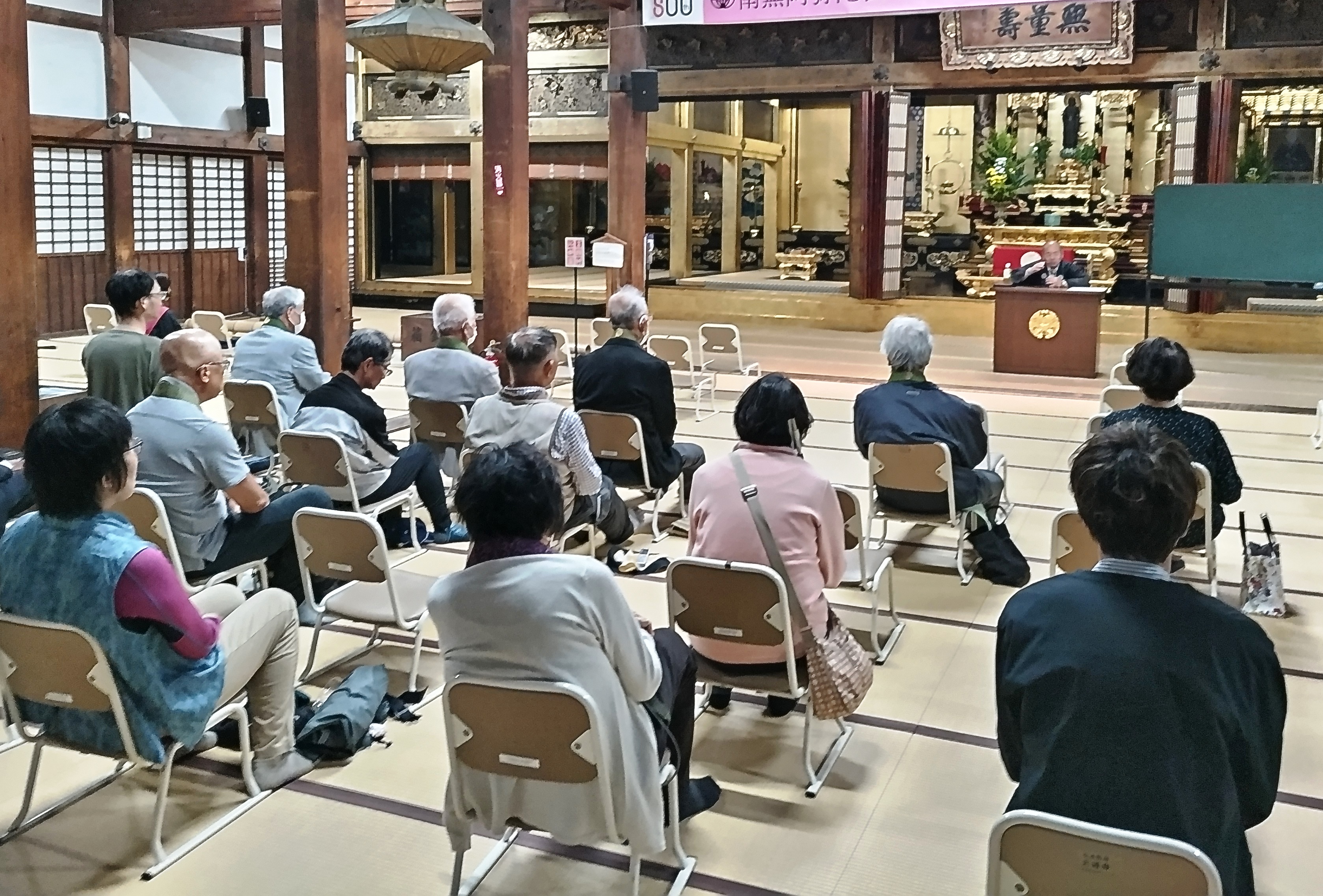 ↑お勤めの後、随行教導より法話 於長浜別院本堂(18:39撮影)宿泊