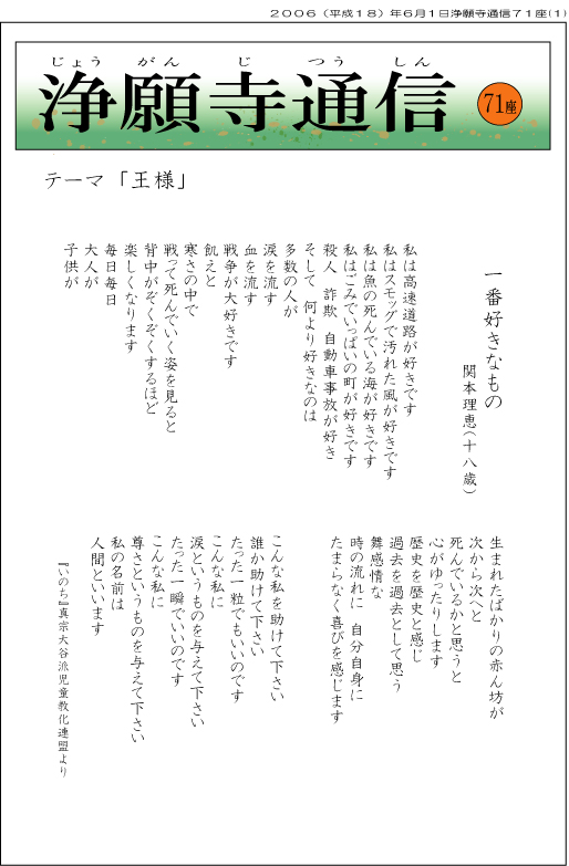 ▼今、表紙の詩を頂きたいと思います。私たち一人ひとりが「王様」を目指す心で、限りなく作り出す現実社会を「好き」という言葉で批判し、そしてそのことを全身をあげて身が叫んでいる、「人間」というものを見つめておられます…。