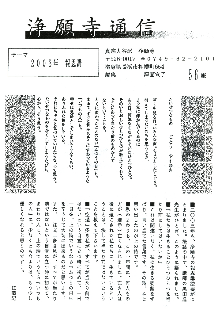 ■二〇〇三年も、浄願寺の報恩講法要が勤まりました。法話の中で、講師の黒田進先生がひと言、このように語られました。