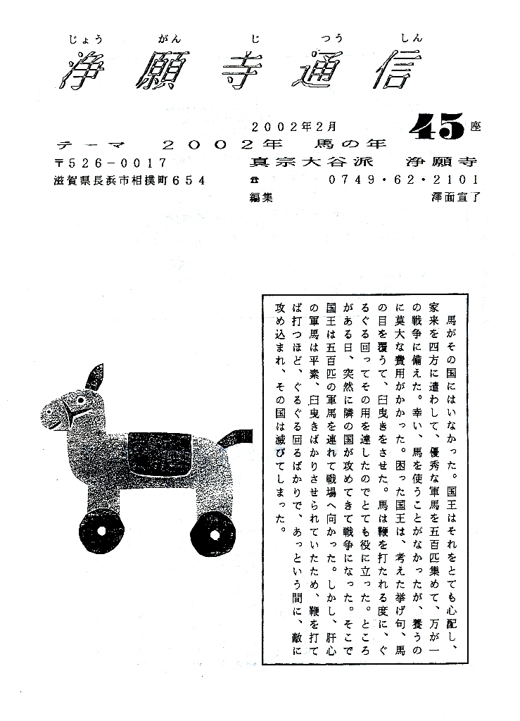 ※この通信の発行後、数人の方から、表紙の馬の話はこの時代、戦争推進のように読んでしまうのでは…との批判をいただきました。ほんとにそうです。お経とはいえ、いや、お経だからこそ、気をつけていただきたいと思います。