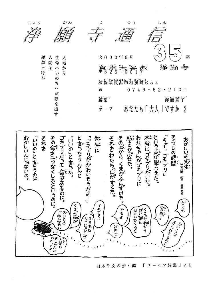 「社会」という名のガラス玉の中に、子どもを入れて、大人が下からぽんぽんと叩きます。皆、子どもが頭をぶつけることが「成長」「進歩」「向上」だと思い、そして、「大人」にすることを教育と呼びます。どうでしょう、このことを考えるには、表紙の詩や言葉なんかは、実に的確な一例です。私たちも「社会」という名のガラス玉の中で、ぽんぽんと叩き、叩かれ、習慣づけられたことがいっぱいあるに違いありません。跳ばないノミのように本当でないものを本当として生きているのが、実は私たちの姿ではないでしょうか。