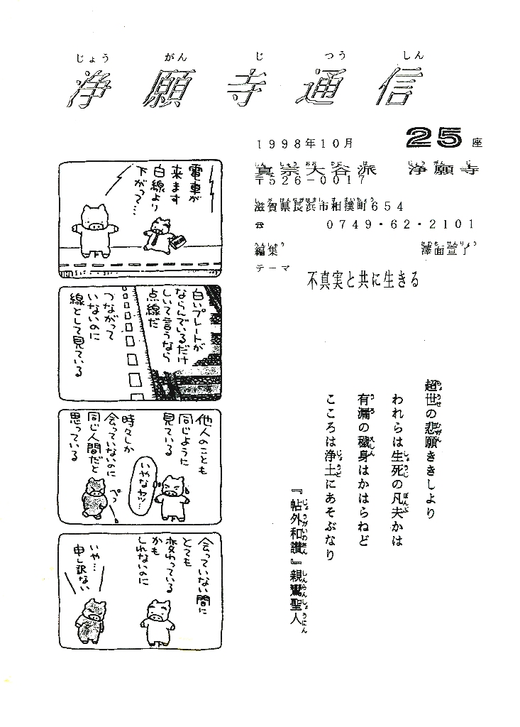 ◆この詩、表紙の漫画から教えられます。周りのことを四六時中、見つめることが不可能な私は、万事、私が見た世界しか知りません。にもかかわらずこの世界を絶対だと思い込んでいます。親鸞聖人は、そのことを「有漏の穢身」であると、人間は、常に漏れることが有るのだと和讃されています。