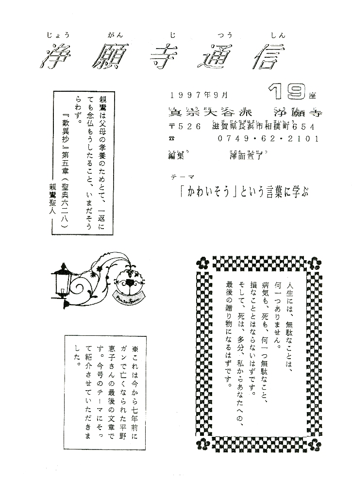 ▼どうでしょう、私たちが亡き人に対して「かわいそう」と言う時、それはもう、亡き人から贈られていたものを、表紙の平野恵子さんの言われるような最後の贈り物を受け止め直すという姿勢からは程遠いと思います。どうかすると、上から下への行為です。だから「慰霊」なんて表現になるのだと思います。霊を慰めるほど、そんなに私たちは偉いのでしょうか。親鸞聖人は、亡き父母のために念仏するのではないと、決して、「ため」ではないと言われます。