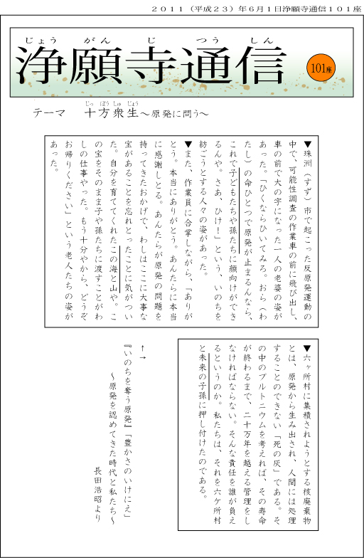 ■今、何よりまず私たちに願われていることは、被災された方々をはじめ、先の牛、馬、豚、鶏、そして表紙の文章の中にある「子どもたちや孫たち」「この海と山」「未来の子孫」…、そのようなあらゆる「十方衆生」の発見ではないでしょうか。