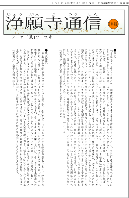 ■法然上人の「愚者になりて往生す」という言葉を生涯、頂き直され、自らを「愚禿」と名告られた親鸞聖人ならばきっと「愚」の一文字を選ばれるのではないでしょうか。