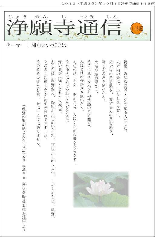 ■さらに、表紙の言葉と重ねながら、今、このように思っています。「聞く」ということは、単に音声を聞くのではなく、また話の内容を聞くという次元のことでもありません。文中に親鸞聖人のことを「風」「雨」「雪」「父」「母」「愛する人」「師」「友」「大地」「海」「そこに生きる人びと」「みほとけ」の呼び声を聞いた人と書かれているように、「聞く」ということは、その存在の前に身を据えるということだと思います。