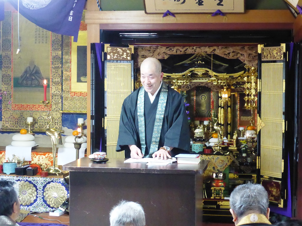 ↑法話 佐藤義成氏(湯次 満徳寺住職)