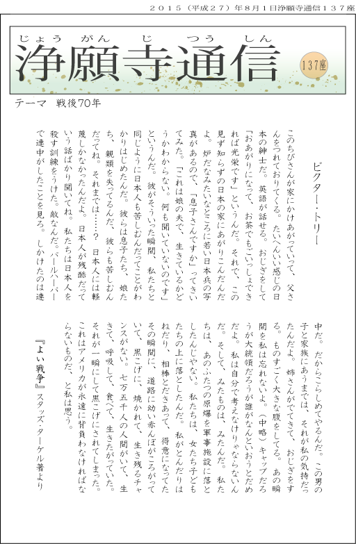 ▼ここ数年、国政は憲法改正や集団的自衛権行使容認といった間違った方向に進んでいます。戦後70年、あらためて、一人ひとりが不戦の言葉を胸に、やはり自分で考えねばなりません。
