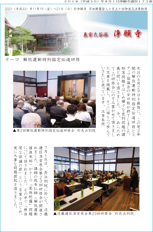 ▲7月18日、長浜別院に於いて、近畿連区准堂衆会第23回研修会が開催されました。講師の阪本仁師(解放運動推進本部)がテーマ「是旃陀羅」問題について話されました。その中で「無自覚な読誦の罪」という言葉をはじめ、実に大事な問題提起を頂きました。
