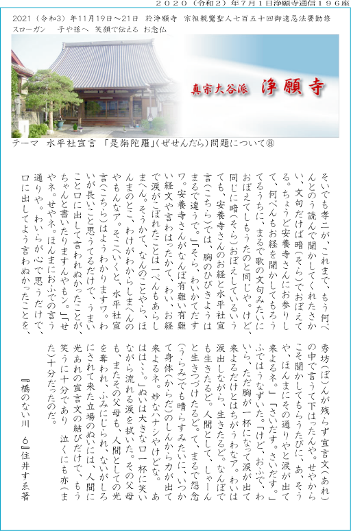 ▼表紙の文章は、孝二の母「ふで」と祖母「ぬい」との会話で、秀坊とは水平社宣言の起草者である村上秀昭(モデルは西光万吉)です。私は語句訂正等を要請される経典と水平社宣言ではやはり次元が違うと思っていたのですがこの文章に出遇い、次元が違うことはないと思い直しています。さらに住井すゑは別の場所でこのように語られています。