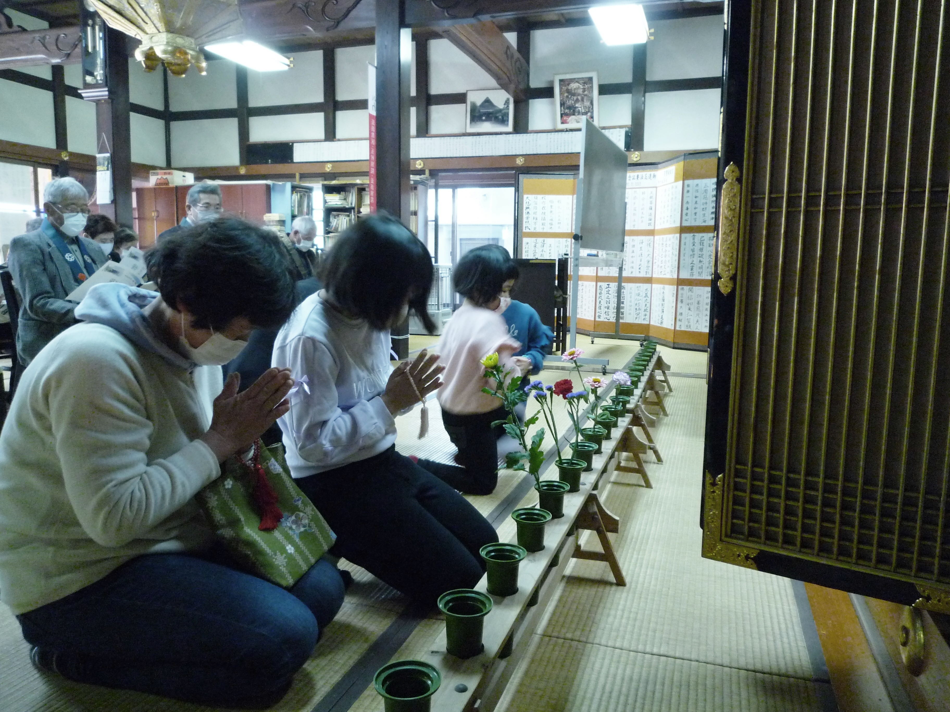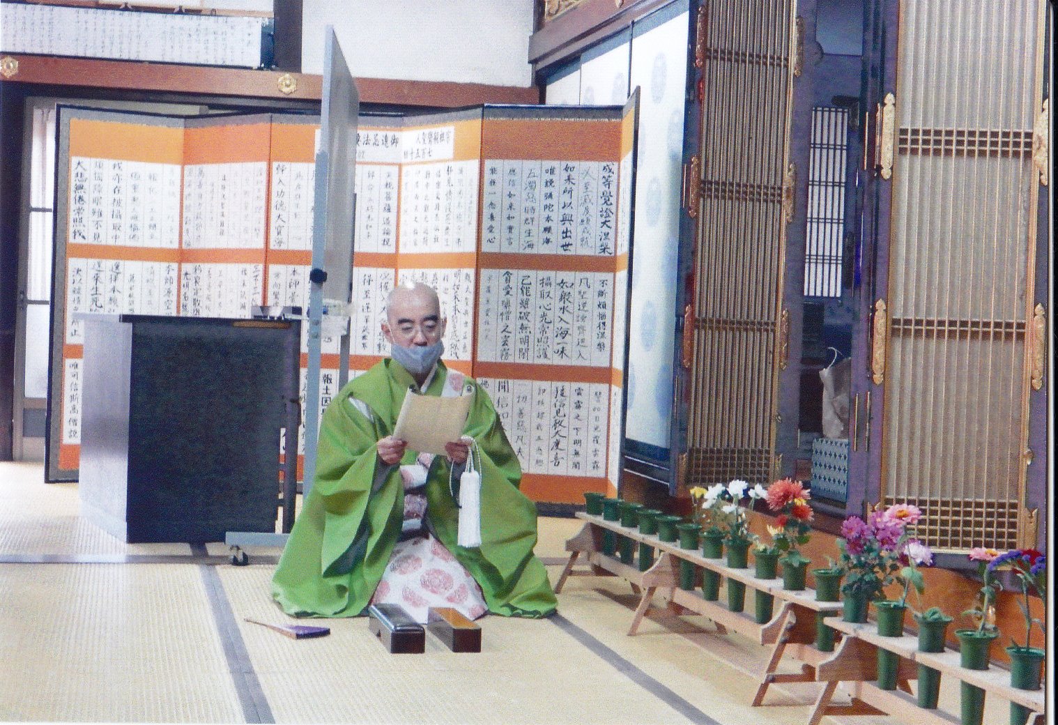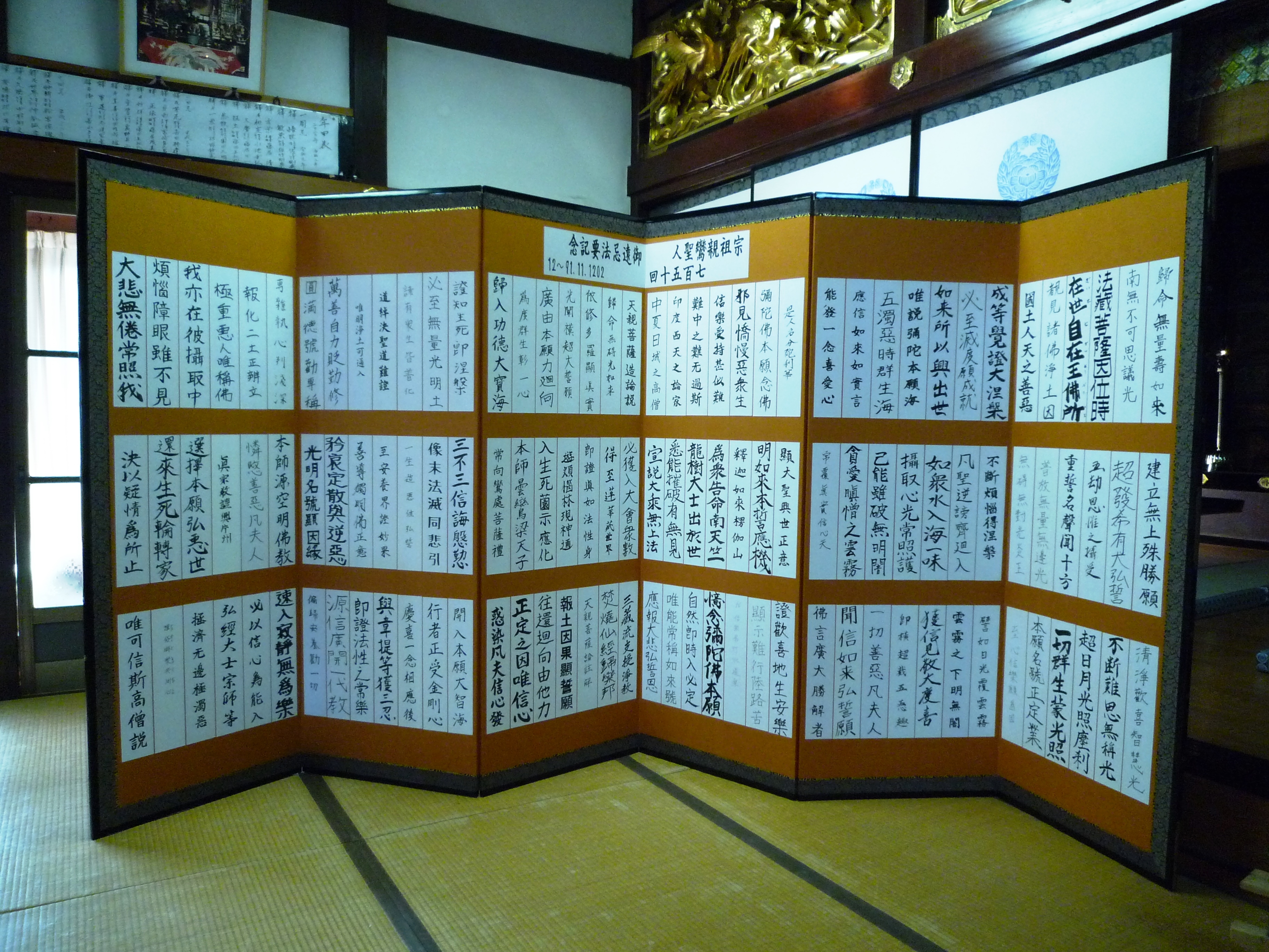 ▼お待ち受け事業である、手作り屏風に短冊(ご門徒様各戸で正信偈1行記述)を張り付ける」事業が今年の報恩講で公表(お披露目)されました。)(他所門徒様10戸含む)