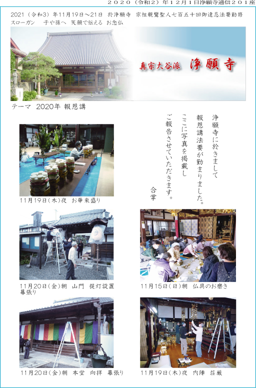 11月20日(金)から11月22日(日)、浄願寺に於きまして報恩講法要が勤まりました。ここに写真を掲載しご報告させていただきます。尚、本文の文責はすべて住職にあります。(浄願寺通信に写真を加えています。)合掌