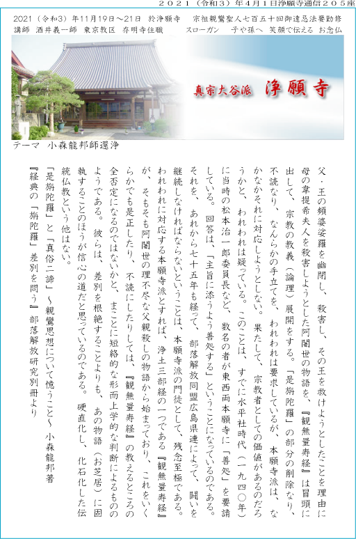 ■2月26日、小森龍邦師(※1)が還浄されました。今、思い出されることは、1989年4月20日、5月22日の「真宗大谷派糾弾会」での質疑です。その聡明な印象と発せられる言葉はひとえに親鸞聖人に帰れの叫びでした。