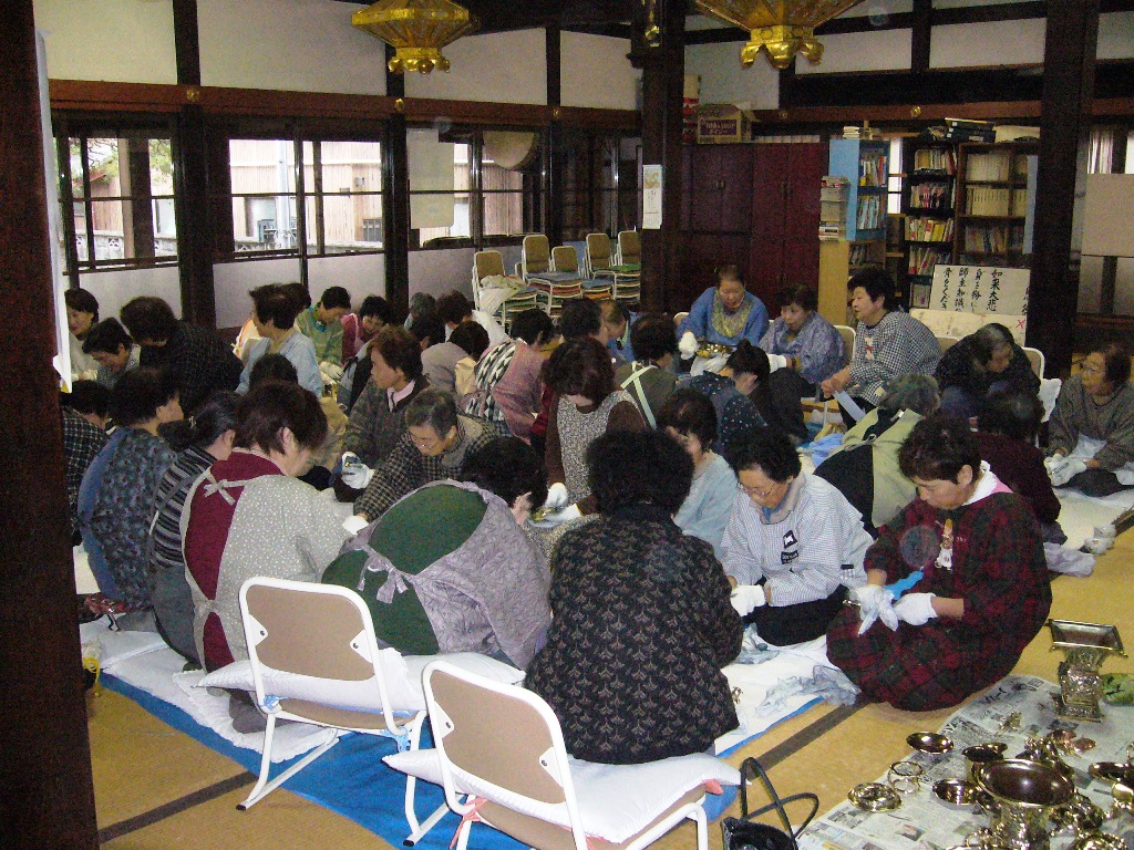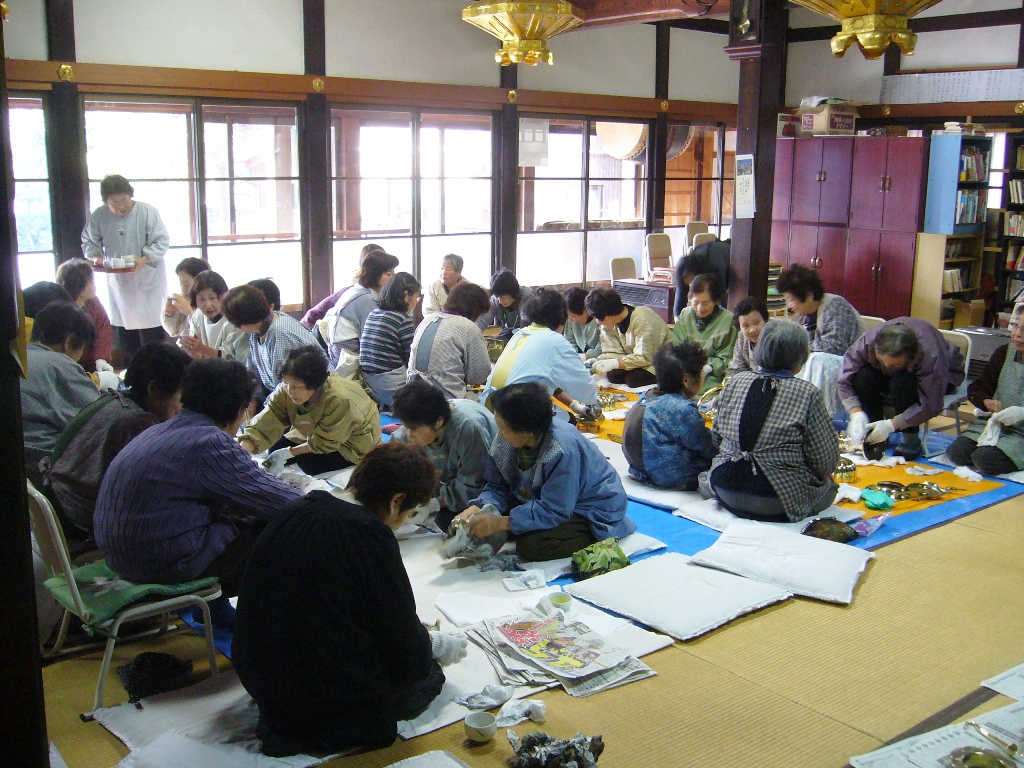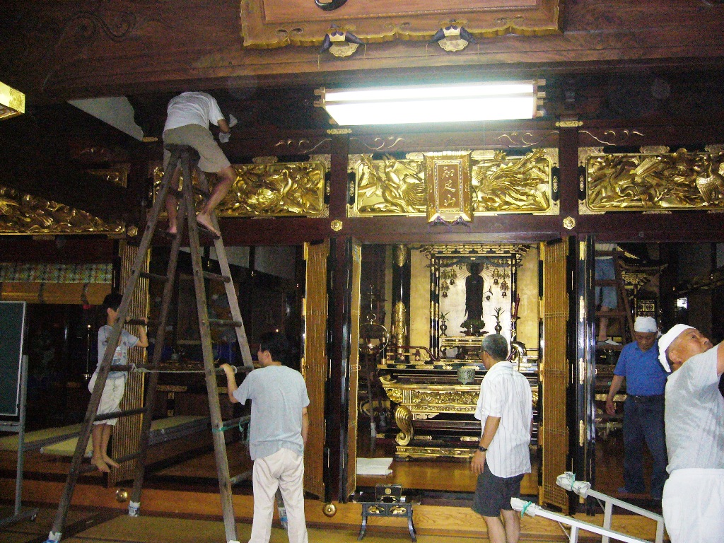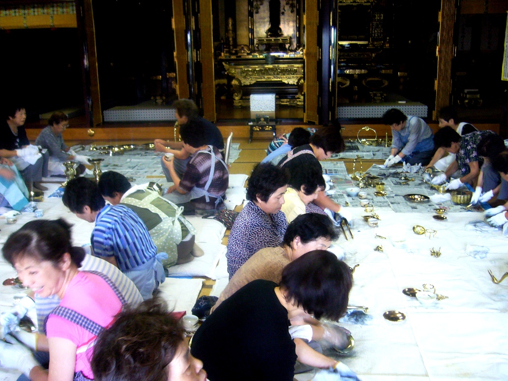 (写真は盆会法要前の仏花、打敷等の荘厳準備)
